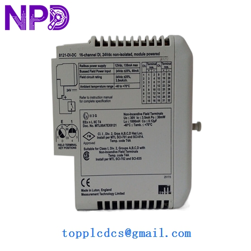 The MTL 8121-DI-DC is a high-density, 16-channel discrete input module designed for the PAC8000 (formerly 8000 Series) I/O system. It is specifically engineered to interface with “dry” (voltage-free) contacts, providing its own 24 VDC wetting voltage to the field switches.